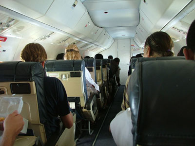 GTAirの飛行機内 ラブハンバジョーへはメルパチ航空もあるのですが、GTAilinerのほうが 安くてスケジュールもわりと正確なので人気です。(2005/10) |